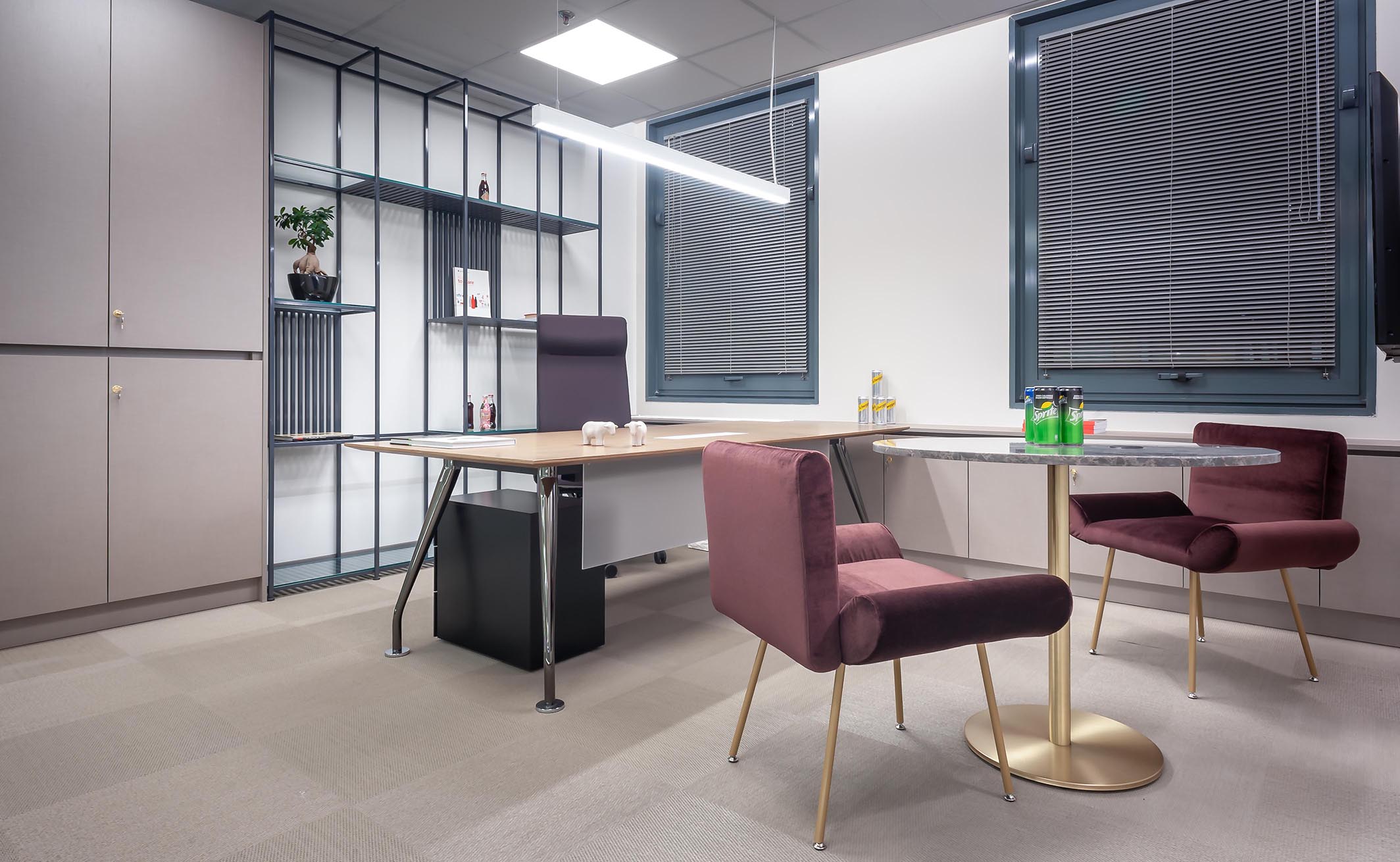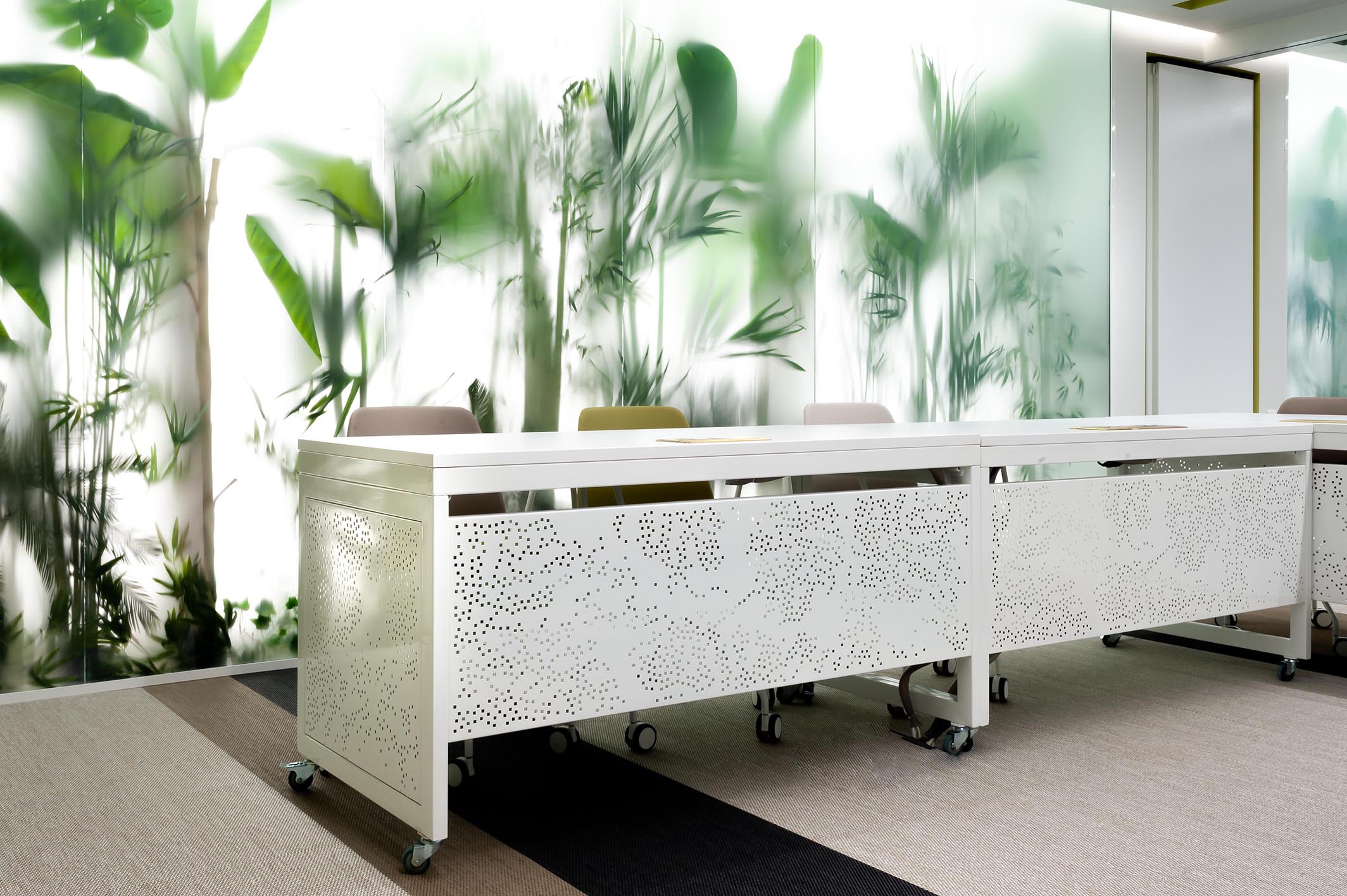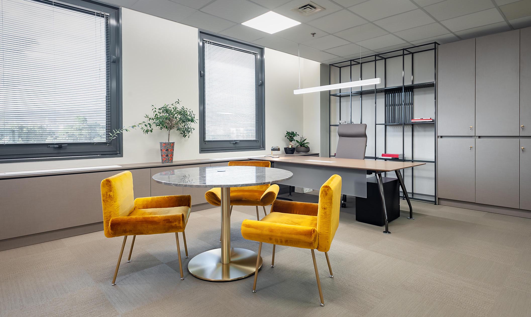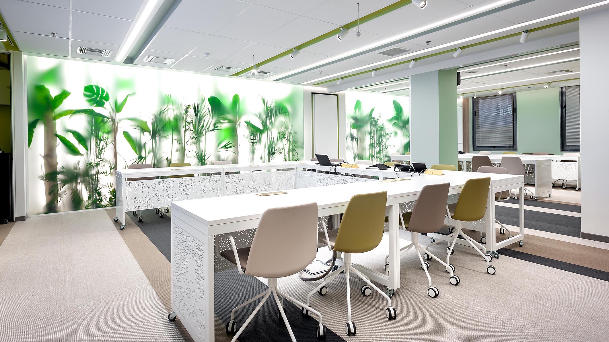 Εσωτερική διαμερισματοποίηση με γυάλινα ηχομονωτικά διαχωριστικά που επιτρέπουν την μετάδοση φωτός σε όλους τους χώρους του ορόφου δημιουργώντας χώρους ιδιωτικότητας διευθυντικών γραφείων και Meeting Rooms.