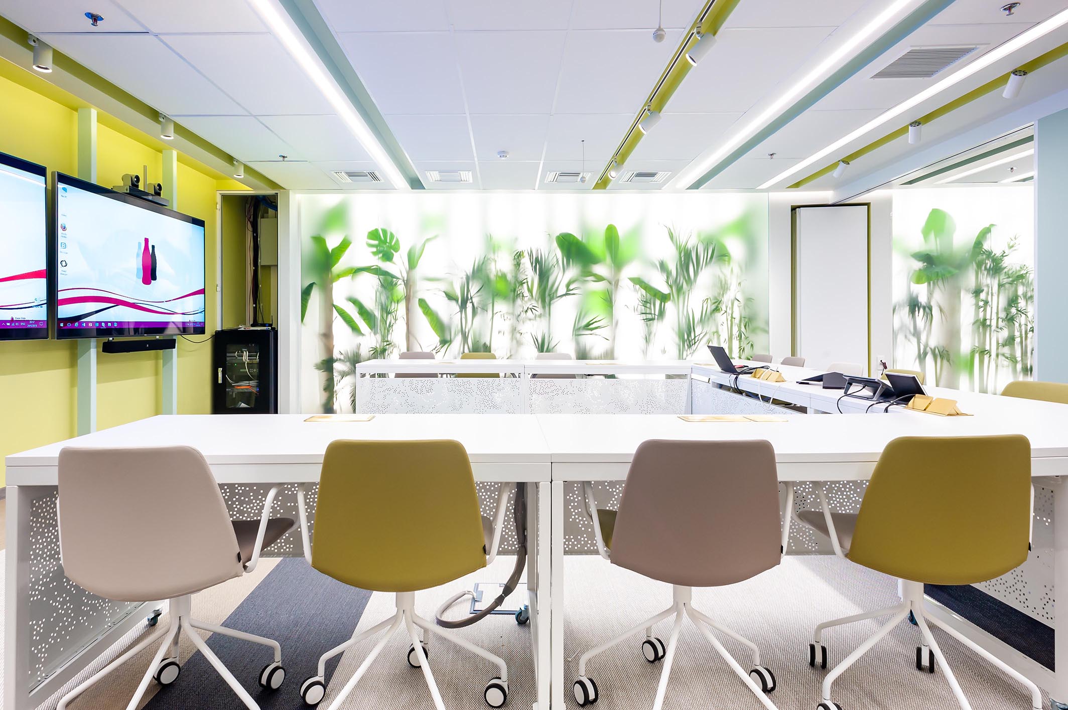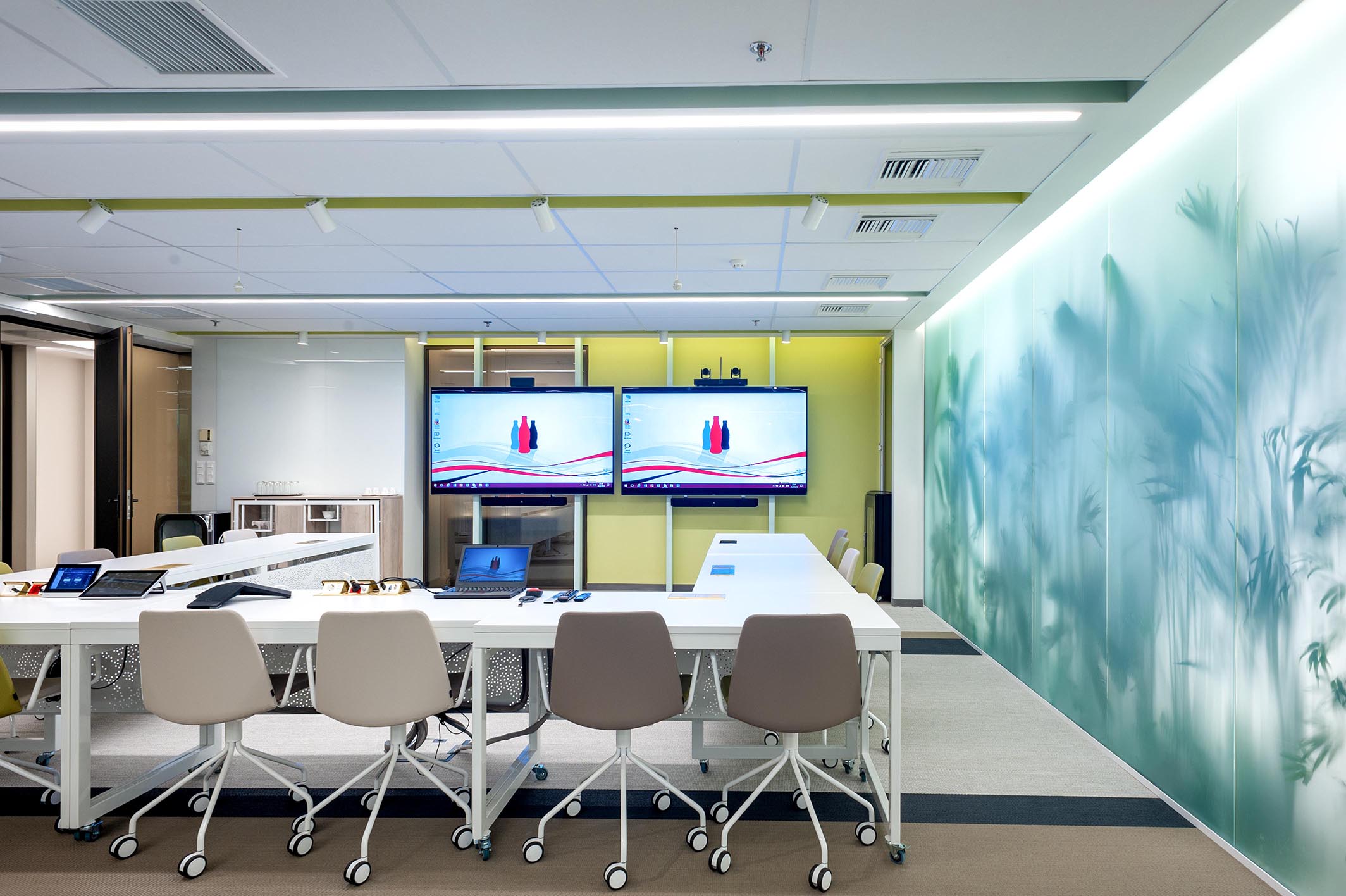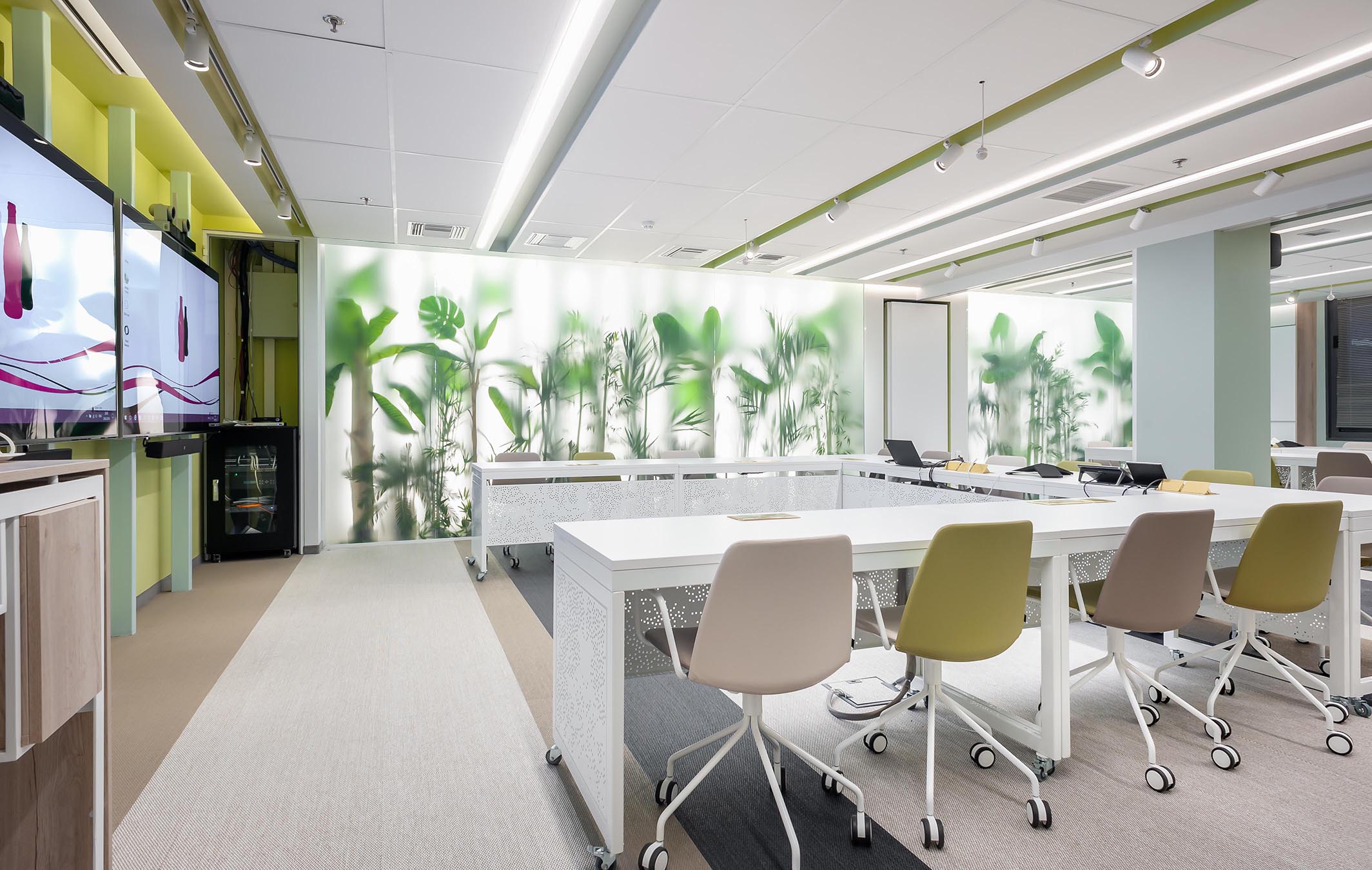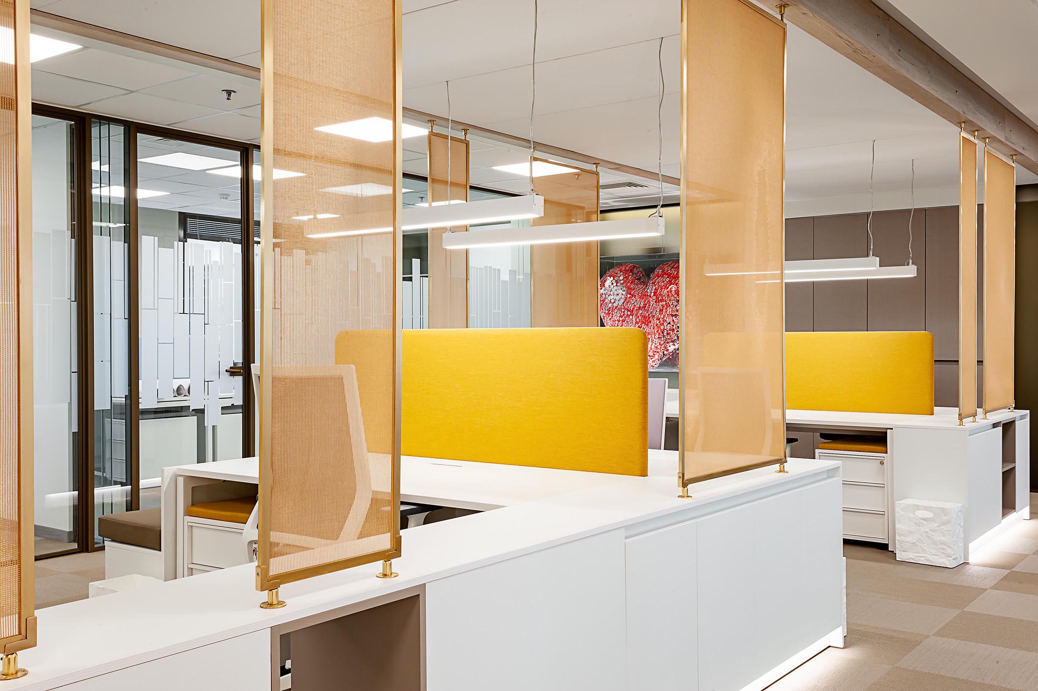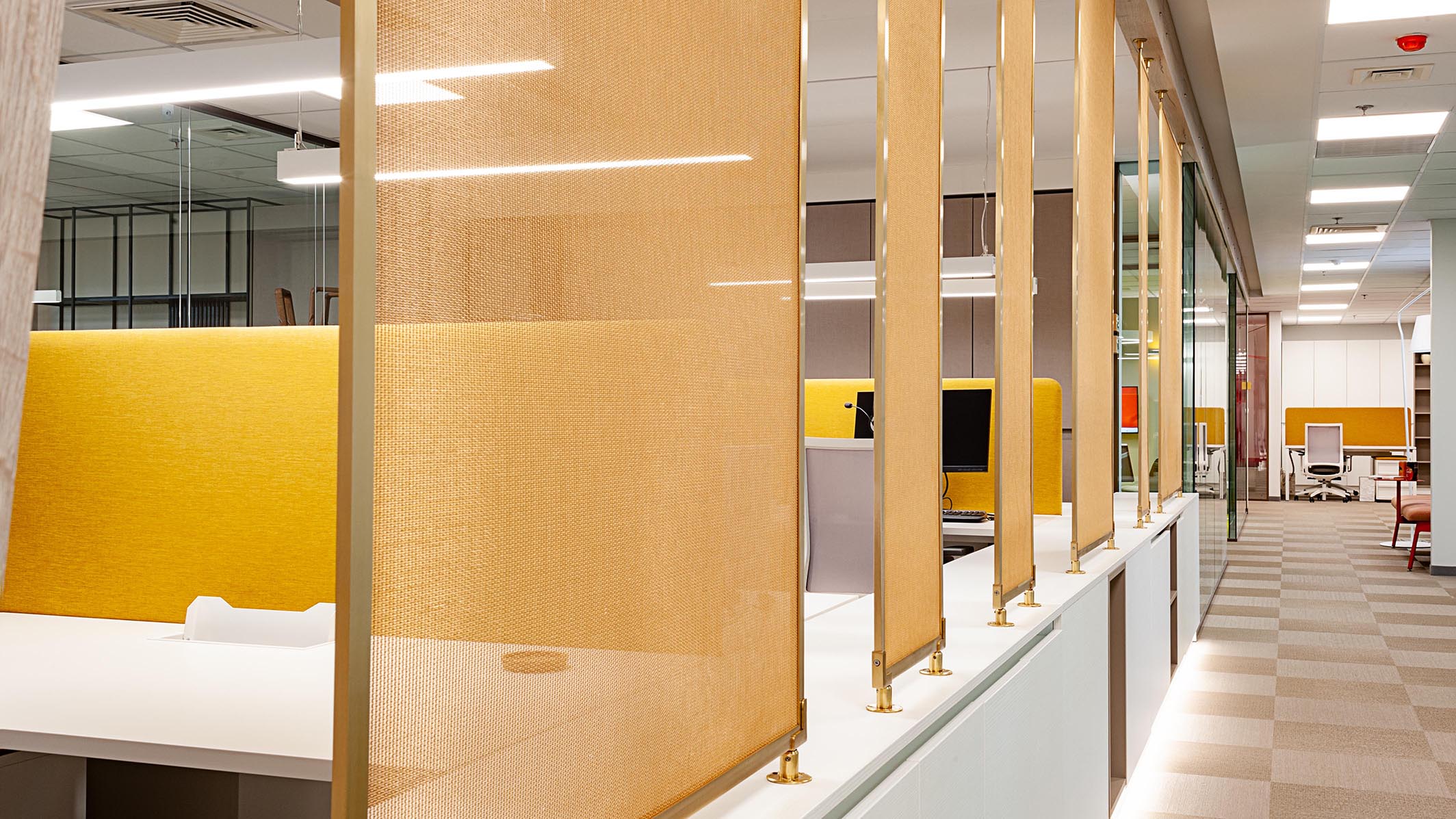 Εσωτερική διαμερισματοποίηση με γυάλινα ηχομονωτικά διαχωριστικά που επιτρέπουν την μετάδοση φωτός σε όλους τους χώρους του ορόφου δημιουργώντας χώρους ιδιωτικότητας διευθυντικών γραφείων και Meeting Rooms.